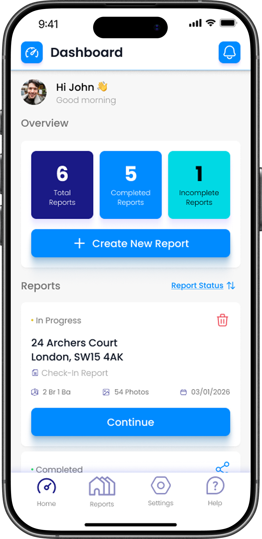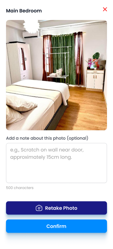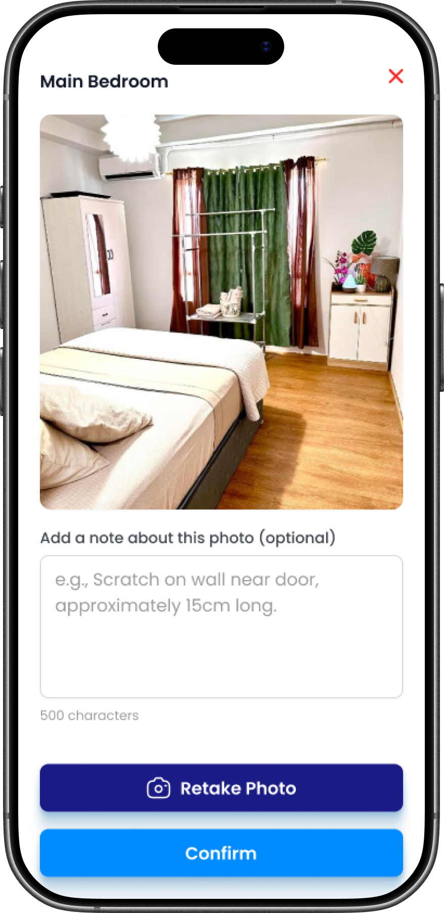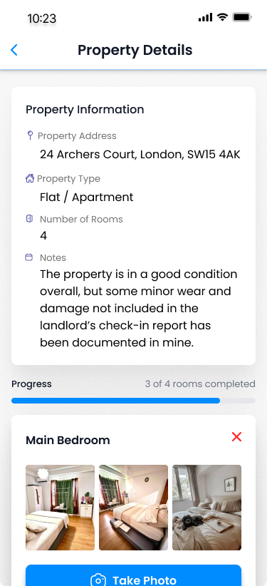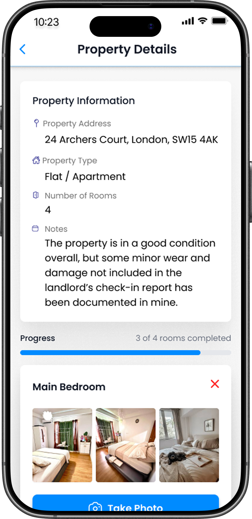 You walk through the property using your phone, room by room, taking photos and adding short notes wherever something isn’t perfect — marks, damage, wear, or anything you want to flag. Photos are captured in-app and automatically time-stamped, so there’s a clear record of when the evidence was created.